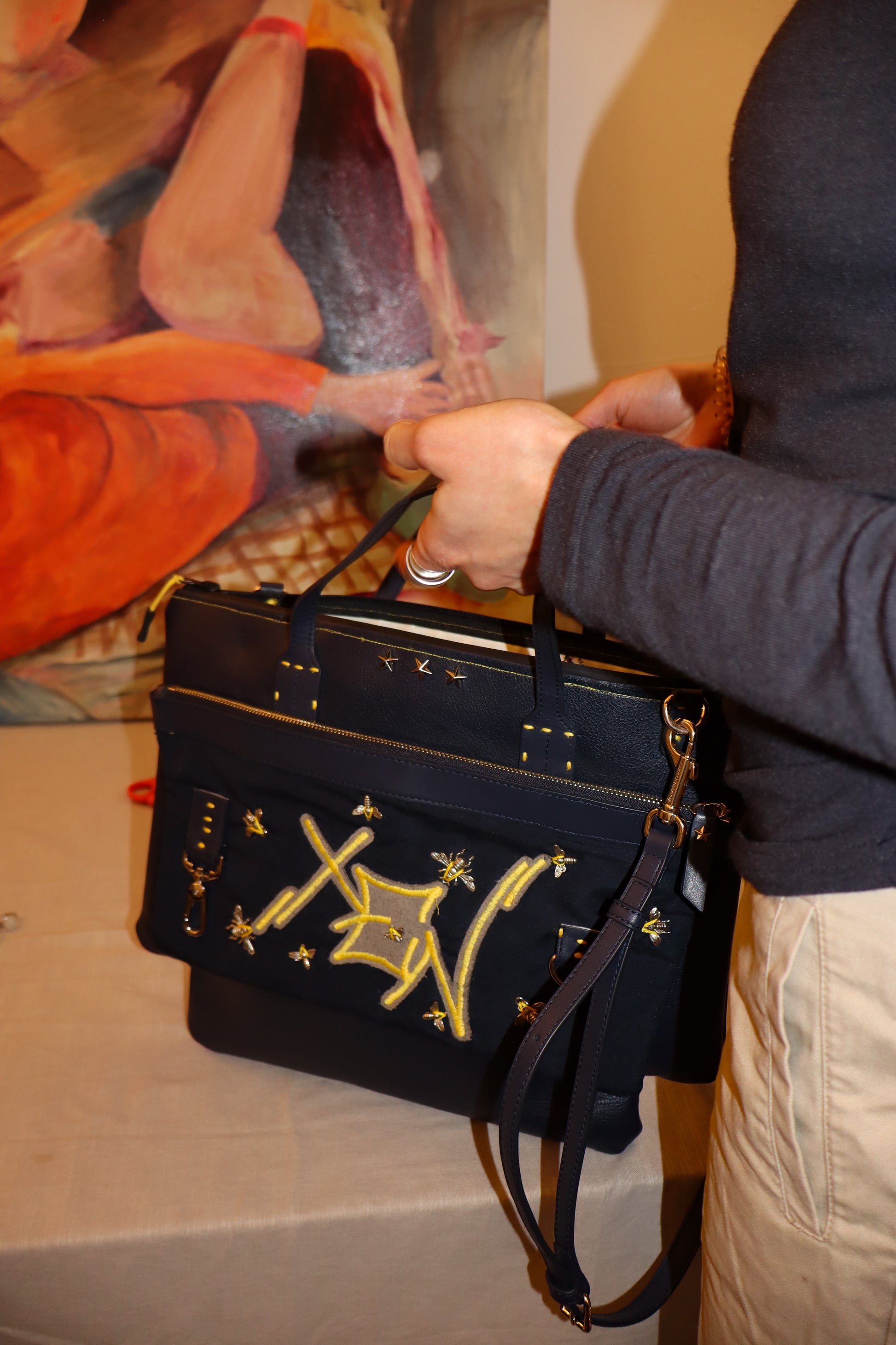 Originally this was a leather tote bag it was then deconstructed, turned inside out, the panels were re shaped and repurposed. Before the embellishments could be added.